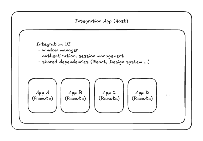 Host App인 통합 애플리케이션은 윈도우 관리, 앱 간 전환, 인증 같은 공통 기능을 제공하고, 각 Remote App을 필요한 시점에 동적으로 로드합니다.