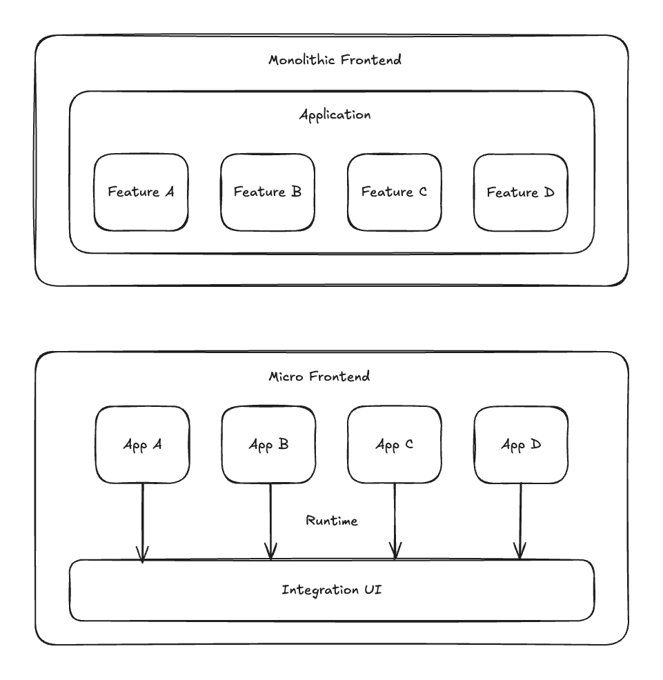보통의 전통적인 모놀리식 프론트엔드에서는 하나의 거대한 코드베이스가 전체 UI를 담당합니다. 반면 Micro Frontend에서는 전체 애플리케이션을 여러 개의 독립적인 프론트엔드 애플리케이션으로 분리하고, 이를 런타임에 하나의 화면으로 조합합니다.