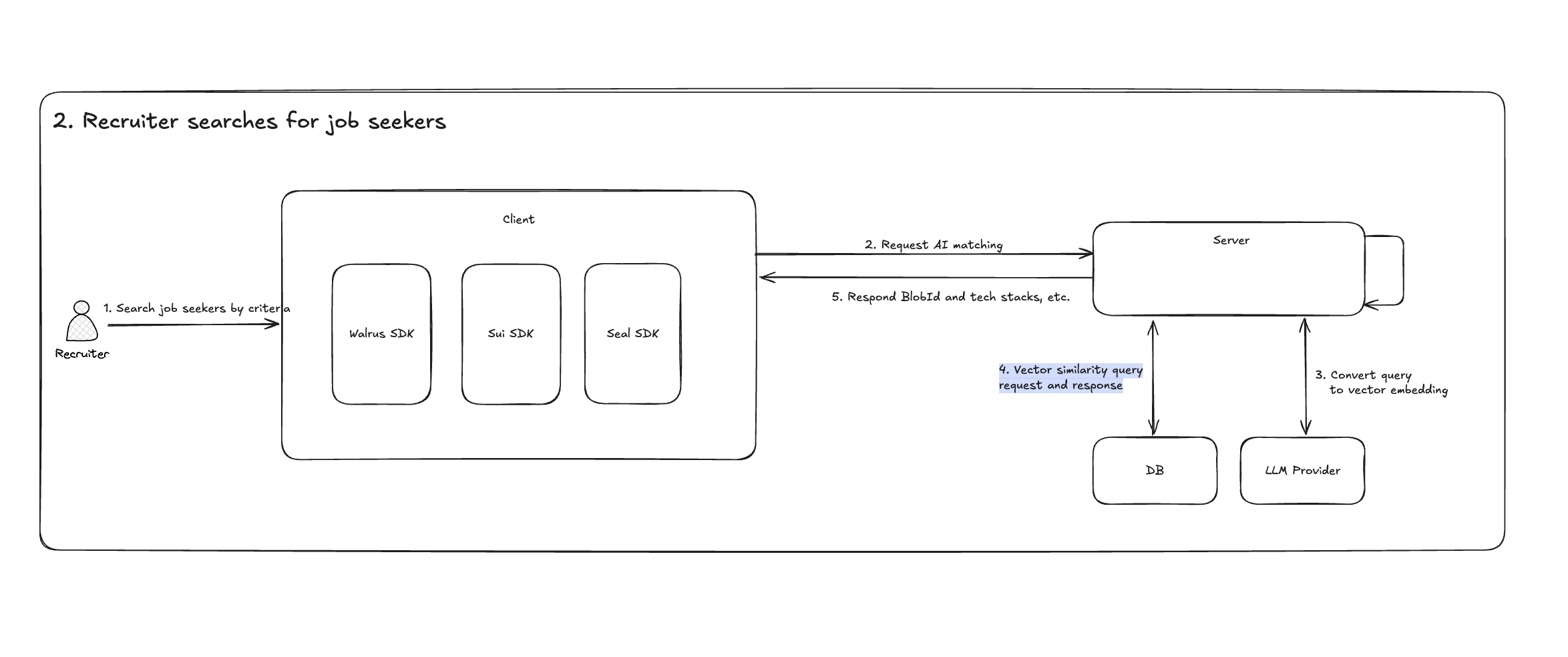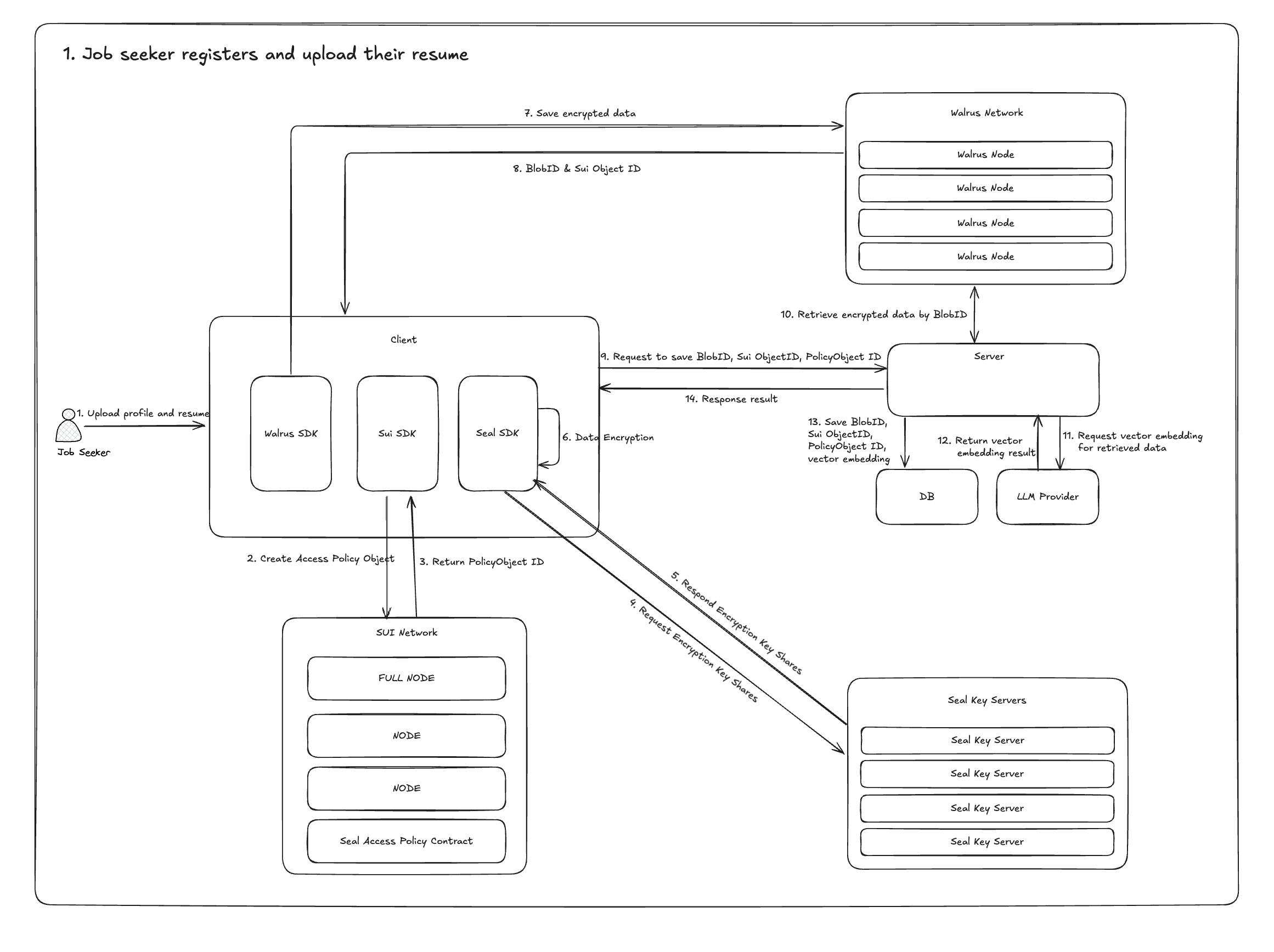 이후 클라이언트 단에서 Seal SDK를 사용해 이력서를 암호화합니다. 암호화에 사용되는 키는 Seal Key Servers에 분산 저장되며, 암호화된 이력서 파일만 Walrus 네트워크에 업로드됩니다.