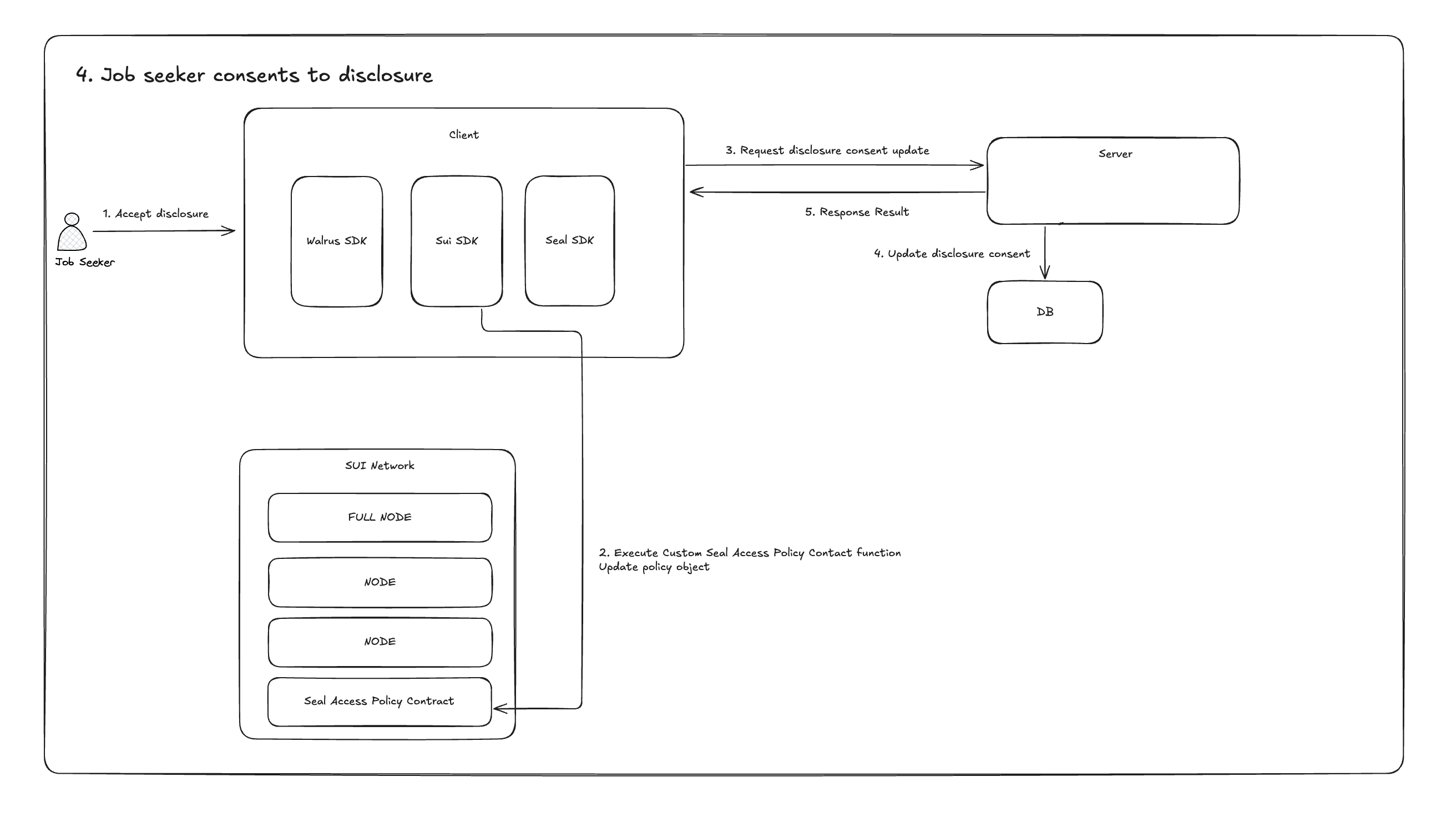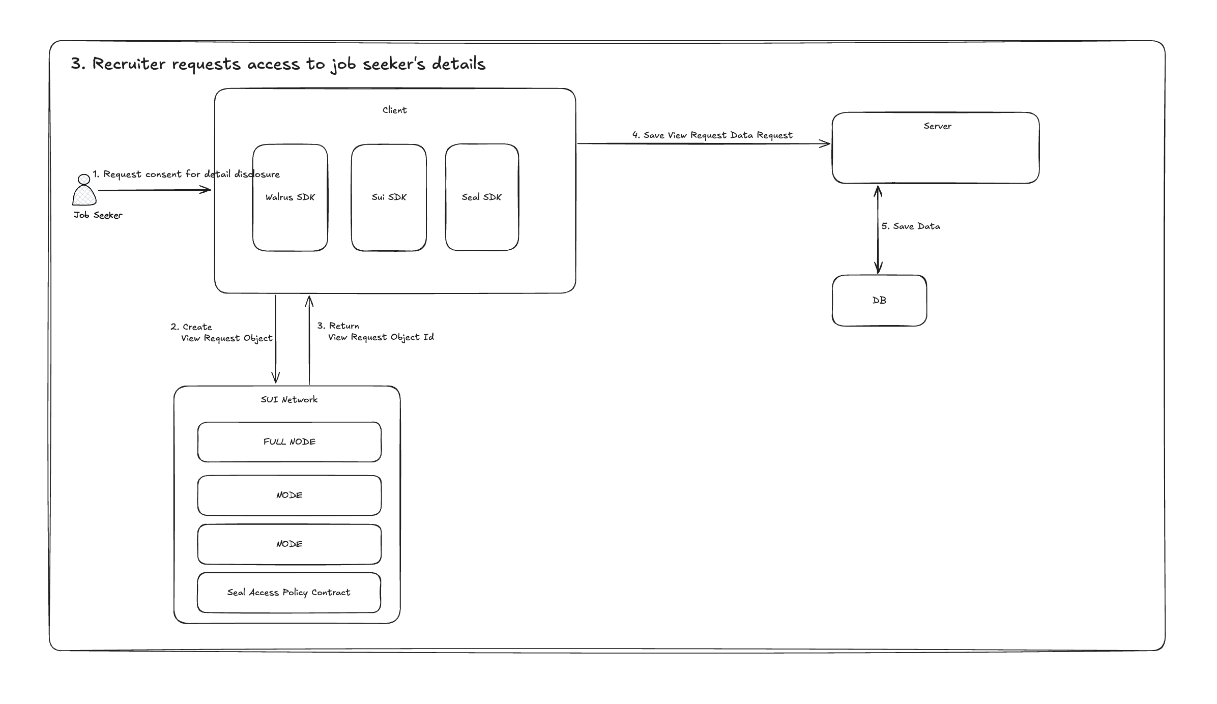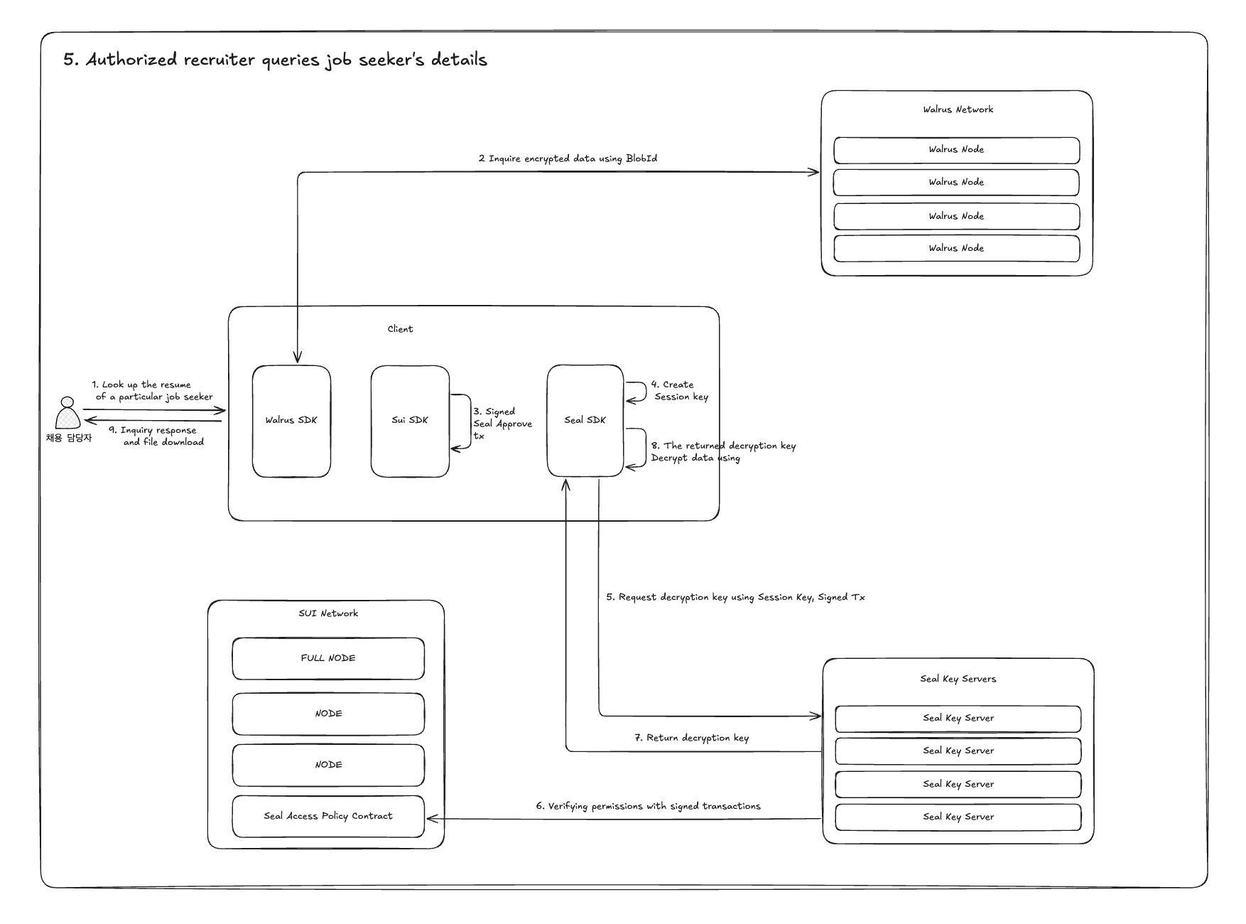 암호화된 이력서 자체에 접근하는것은 Walrus를 통해 가능할 수 있지만, 복호화를 위해서는 Seal Server를 거쳐야 하기 때문에 열람 권한이 승인된 경우에만 채용 담당자는 Walrus 네트워크에서 암호화된 이력서를 복호화할 수 있습니다.